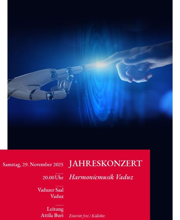 Am Samstag, 29. November 2025, lädt die Harmoniemusik Vaduz um 20 Uhr zum Jahreskonzert in den Vaduzer Saal ein. Unter dem Motto «Zurück in die Zukunft» wird die HMV unter der musikalischen Leitung von Attila Buri ihre Gäste zu einer Reise durch die Menschheitsgeschichte einladen und einen Blick in die Vergangenheit werfen. Doch was wird die Zukunft bringen? Die HMV ist auf eine neue Entwicklung gestossen, welche die Musikwelt in Zeiten von KI revolutionieren könnte. Lassen Sie sich überraschen! Eintritt frei, Kollekte.